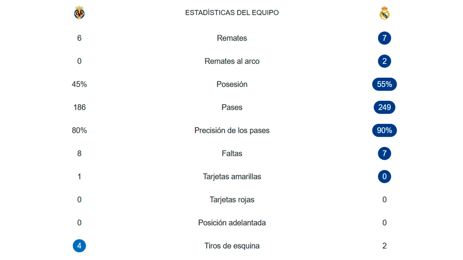 Estadísticas de Villarreal vs. Real Madrid en el entretiempo