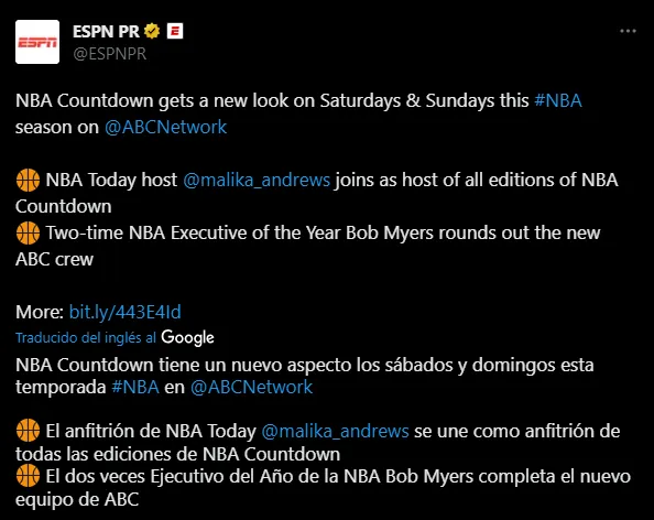 La cuenta oficial de prensa de ESPN anunció de manera oficial que Myers “completa el nuevo equipo de ABC (canal)” para estar junto a Stephen A. Smith, Malika Andrews, Michael Wilbon y Adrian Wojnarowski, en el programa NBA Countdown (Cuentra Regresiva de la NBA) que cubre los partidos estelares de los sábados y domingos.