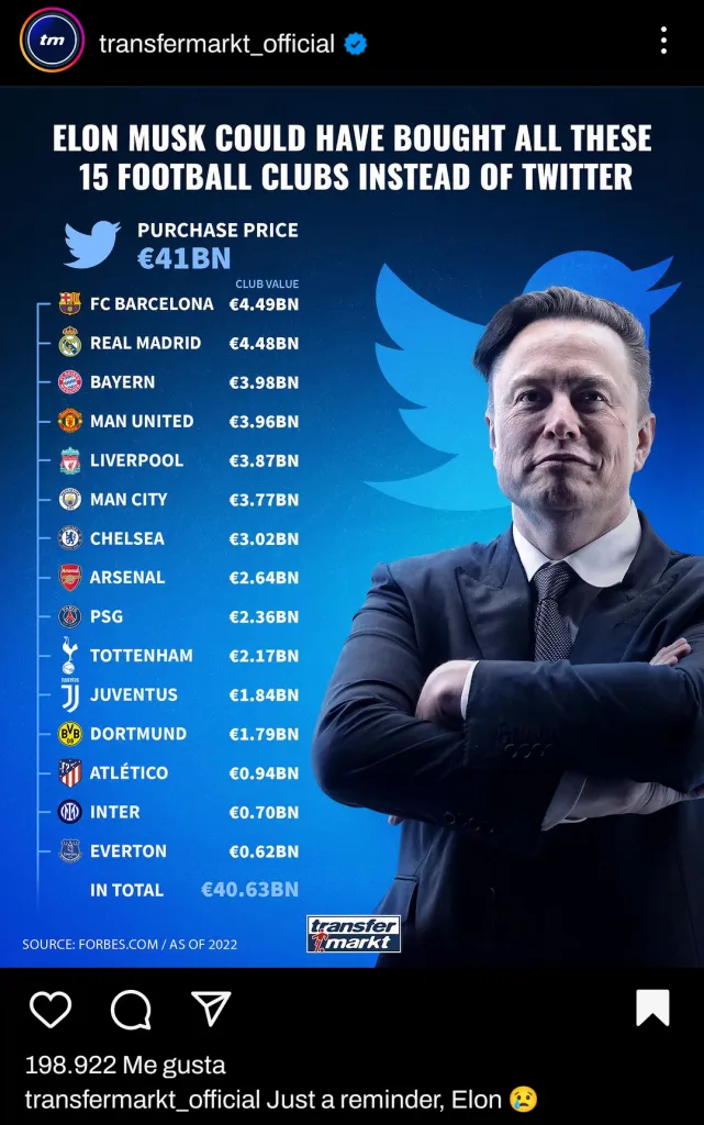 El sitio Transfermartk, la máxima referencia en el fútbol en cuanto a valuaciones, publicó este jueves una sugerencia sobre cómo debió Elon haber gastado su fortuna. Con Barcelona y Real Madrid a la cabeza, jugaron con la posibilidad de comprar a 15 clubes que entran en aquella valuación.