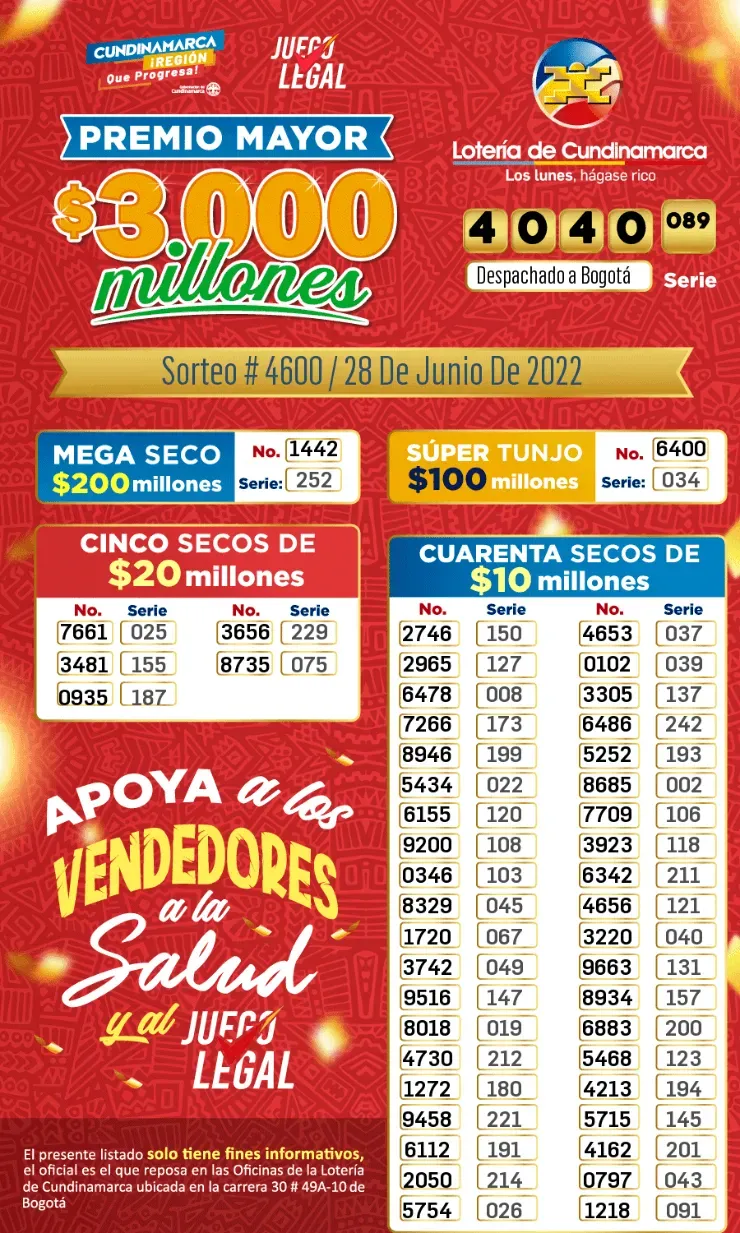 El premio mayor en la Lotería de Cundinamarca es de 3.000 millones de pesos. Pero, además, existen importanes premios secundarios. El Mega Seco es de $200 millones, luego hay otros de menos valor.