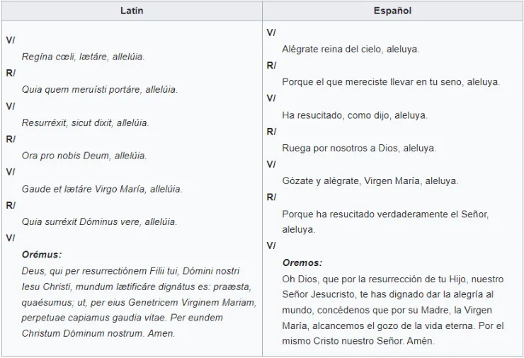 El Regina Cœli sustituye el rezo del Angelus durante el tiempo pascual. Así lo estableció el papa Benedicto XIV en 1742. Litúrgicamente está prescrita en el Breviario Romano desde el inicio del tiempo de Pascua hasta la hora nona del domingo de Pentecostés. Debe ser cantado o rezado en coro y de pie.
