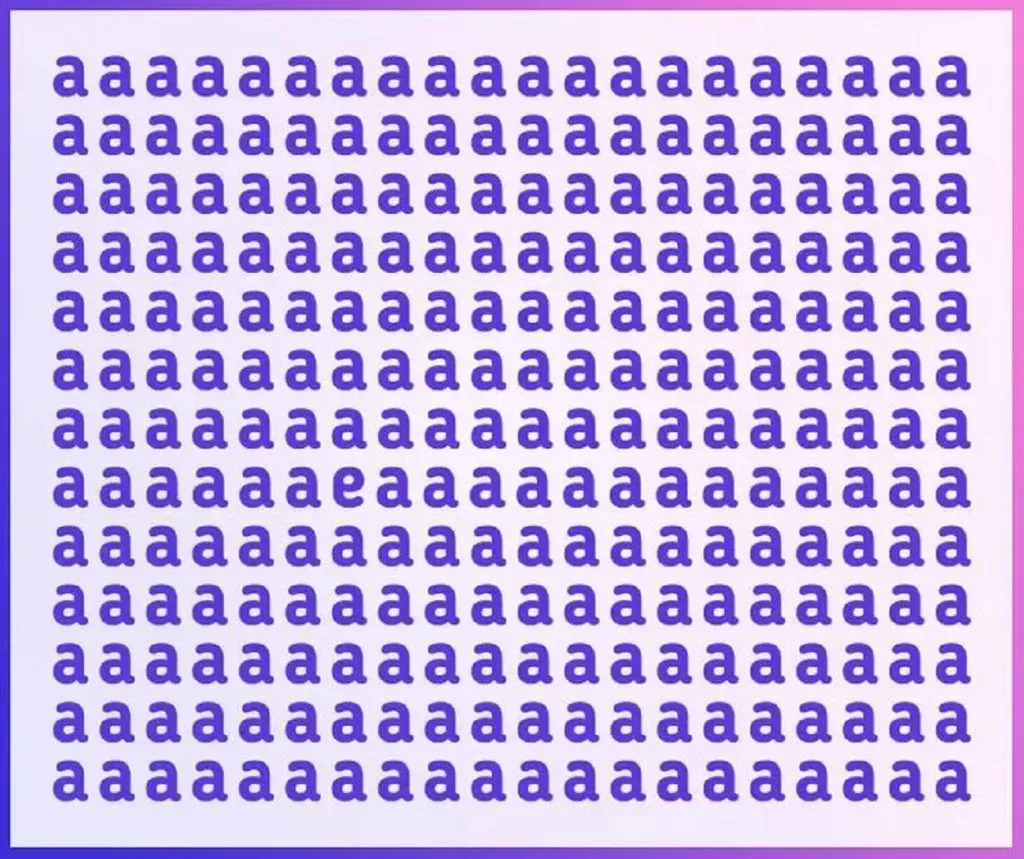 La letra “e” se encuentra escondida dentro de cientos de letras “a”. La verdadera dificultad es el límite de tiempo. Apenas te daremos 7 segundos para superar el desafío visual.
