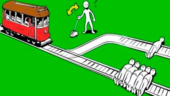 La imagen a continuación presenta a un tren que tiene dos vías para continuar y tú estás al mando de la palanca para elegir qué curso toma. En uno de los caminos hay una sola persona sobre las vías mientras que del otro lado hay cinco.