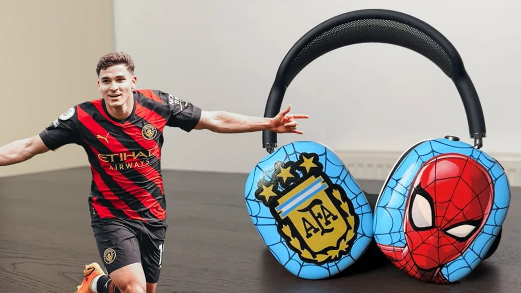 Unas espinilleras personalizadas para Grealish, unas botas para Haaland y unos auriculares para Julián Álvarez. Pintados de celeste y con los logos de la Selección Argentina en uno de los lados, y de Spider-Man en el otro, eran perfectos para Julián.