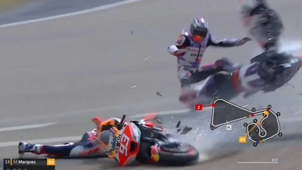 Esto resultó en un impacto que partió al medio la moto del francés, que no pudo hacer nada para evitar el choque. Márquez tuvo la fortuna de no sufrir más que el destrozo de su moto y regresó rápido al box, mientras que Zarco tuvo que ser atendido por los médicos en la pista.