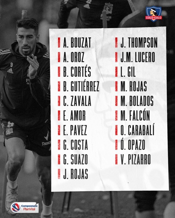 XI COLO COLO: Brayan Cortés; Óscar Opazo, Maximiliano Falcón, Emiliano Amor, Gabriel Suazo; Esteban Pavez, Vicente Pizarro; Leonardo Gil; Agustín Bouzat, Marcos Bolados y Gabriel Costa.