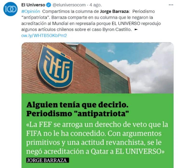 El mismo periodistaexpuso su caso en una extensa columna del diario en el queasegura que la jefa de medios de la federación ecuatoriana, Ximena Crespo, se justificó en que tenían “Pocos cupos y preferimos darlos a medios que se comportaron objetivamente en el caso Byron Castillo, no a ‘El Universo’,que no fue objetivo y tuvo una actitud antipatriótica. Parecía un diario chileno”.