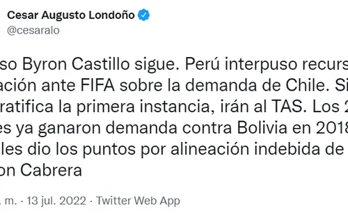Como se recuerda, un mes después de quedar eliminados del repechaje a Qatar 2022,Perú seunió a los reclamosde la Asociación Nacional de Futbol Profesional de Chile(AFNP), contra el lateral ecuatoriano, Byron Castillo, porpresunta falsificación de documentos.