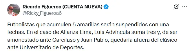 Posteriormente, Alianza Lima volverá a jugar el sábado 21 de marzo frente a Juan Pablo II, partido correspondiente a la fecha 8 del campeonato. Ese encuentro será el último antes del clásico, por lo que cualquier amarilla adicional en estos dos partidos podría complicar seriamente la presencia de Advíncula ante Universitario.