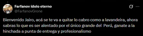 Es que para los hinchas Alianza Lima no es un refuerzo más, sino que se trata de un jugador que debe representar su profesionalismo de la forma más seria posible. Mientras tanto, los comentarios de los aficionados han tenido entre advertencias y burlas para con Universitario.