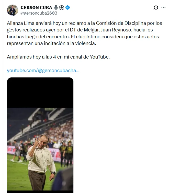 Según informó el periodista Gerson Cuba, la institución blanquiazul ya decidió elevar un reclamo formal. “Alianza Lima enviará hoy un reclamo a la Comisión de Disciplina por los gestos realizados ayer por el DT de Melgar, Juan Reynoso, hacia los hinchas luego del encuentro. El club íntimo considera que estos actos representan una incitación a la violencia”, explicó.