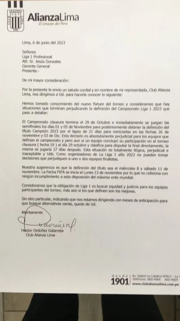 Siendo claros a la hora de imponer un reclamo escrito por los tiempos que debe esperar Alianza Lima en caso no campeone el Torneo Clausura: “Esta decisión es absolutamente perjudicial para los equipos que definan el campeonato, peor aún si un equipo concluyó su participación en el torneo Clausura (fecha 19) el día 29 de octubre y clasifica para disputar la final directamente, la misma se jugaría 27 después. Esta situación es totalmente ilógica, perjudicial e inaceptable y Uds. como organizadores de la Liga 1 Betsson 2023 no pueden tomar decisiones que perjudiquen a uno o dos equipos finalistas”.