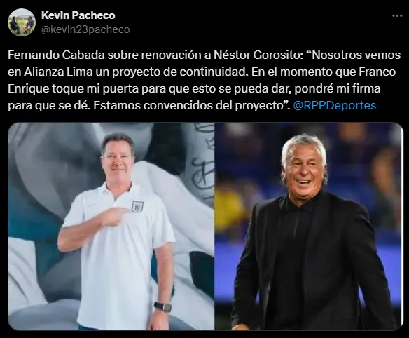 En conversación con RPP, Fernando Cabada Administrador de Alianza Lima fue consultado sobre la continuidad del profesor Néstor Gorosito. Este no dudó un solo momento en mencionar que confía en el argentino, por lo que está dispuesto a mantenerlo en el cargo.