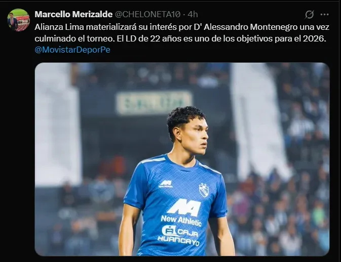 “Alianza Lima materializará su interés por D’ Alessandro Montenegro una vez culminado el torneo. El LD de 22 años es uno de los objetivos para el 2026″; fue la más reciente información que compartió el comunicador deportivo Marcello Merizalde a través de su cuenta oficial de ‘X’ respecto a la visualización concreta de la directiva blanquiazul para quedarse con los servicios del defensor.
