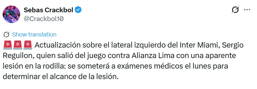 “Actualización sobre el lateral izquierdo del Inter Miami, Sergio Reguilon, quien salió del juego contra Alianza Lima con una aparente lesión en la rodilla: se someterá a exámenes médicos el lunes para determinar el alcance de la lesión”, escribió el periodista Sebastián Carackbol en su cuenta de Twitter.
