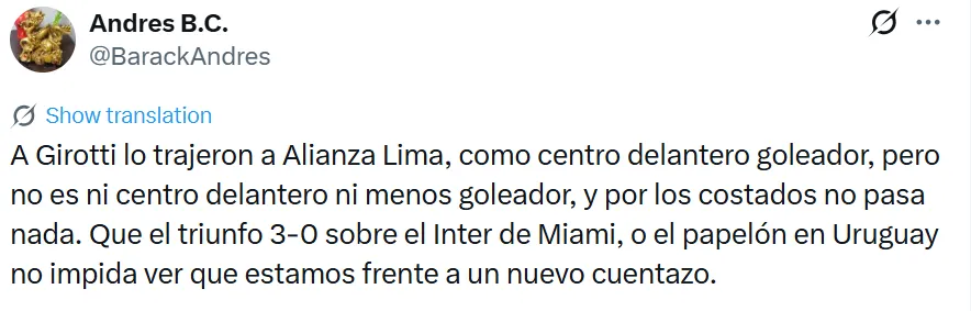 A través Twitter, un sector de la hinchada de Alianza Lima expresó su descontento con la función que viene cumpliendo el delantero argentino. Un aficionado resumió el malestar señalando que Girotti llegó como un “centro delantero goleador”, pero que hasta ahora no ha logrado consolidarse ni como ‘9’ ni jugando por los costados, postura que se reforzó pese al sólido triunfo ante el Inter Miami.