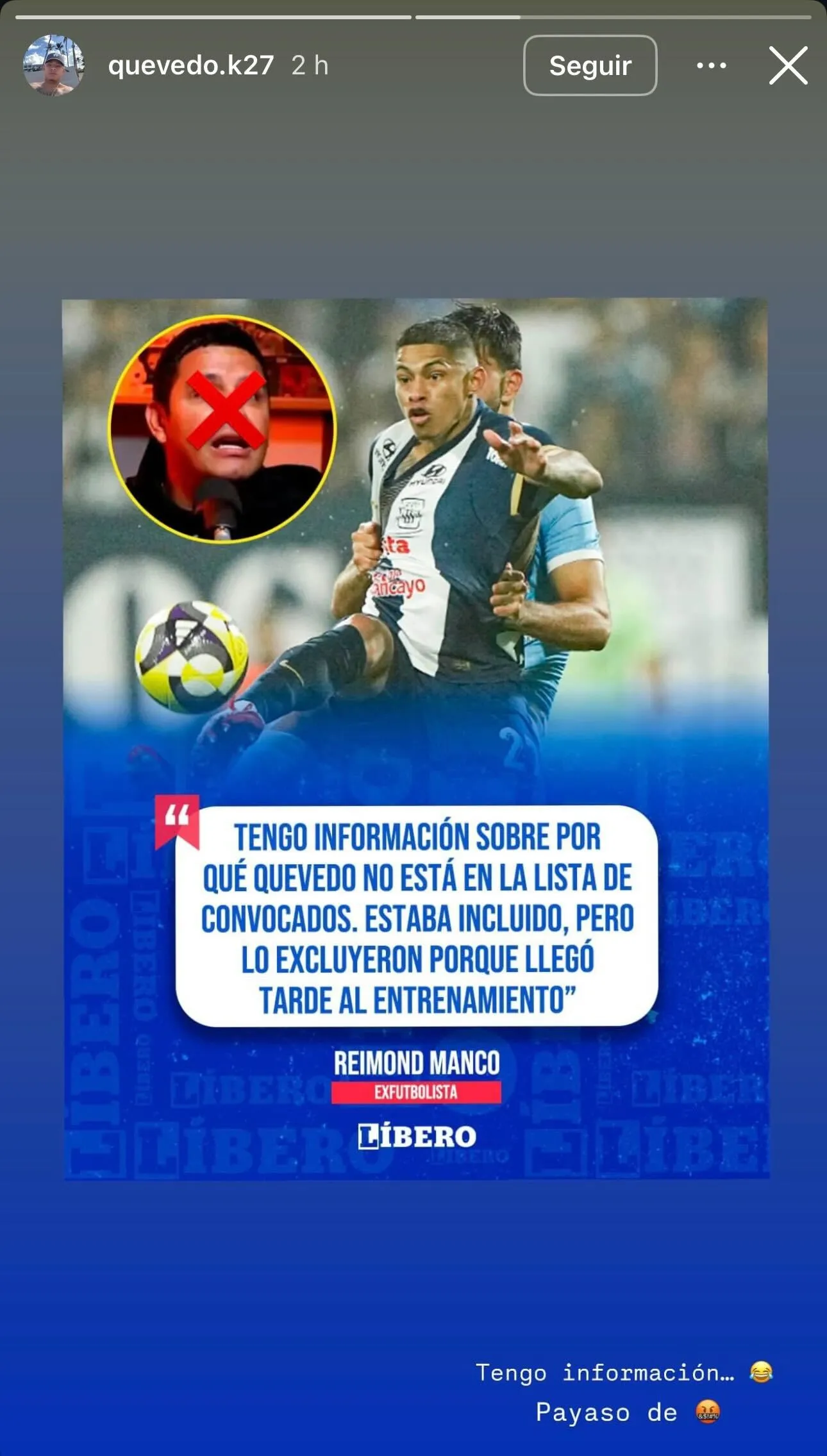 Tras ello, Kevin Quevedo salió al frente y utilizó sus redes sociales para contestarle a Reimond Manco. En un primer momento ironizó con la frase “tengo información”, acompañada de emojis de risa; sin embargo, después elevó el tono y arremetió contra ‘Rei’, calificándolo de “payaso”.