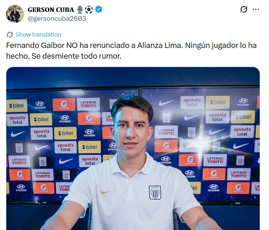 “Fernando Gaibor NO ha renunciado a Alianza Lima. Ningún jugador lo ha hecho. Se desmiente todo rumor”, señaló el comunicador.