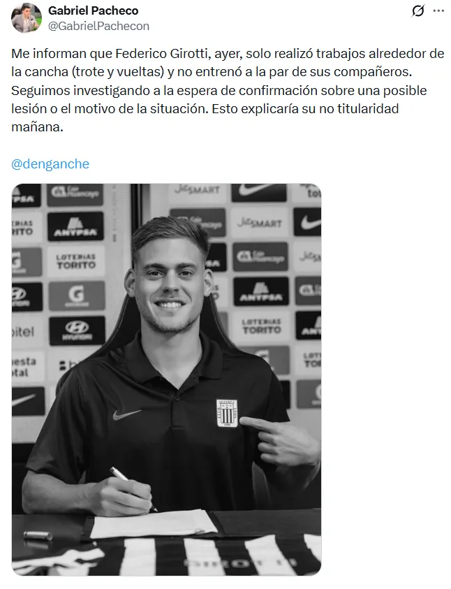 Por ahora, en Alianza Lima mantienen cautela con la evolución de Girotti, mientras el cuerpo técnico evalúa si lo preserva completamente o si puede tener algunos minutos desde el banco en un partido clave para el futuro inmediato del equipo.
