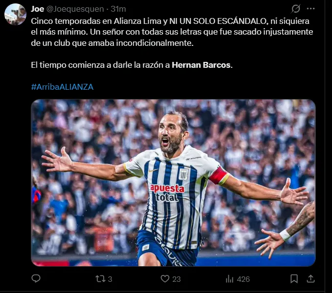 Si bien el delantero argentino no escribió un post o un mensaje como tal, sí compartió una fotografía por parte de su esposa, quien siempre es muy activa en el medio local con un apoyo sincero. Como sabemos, Hernán Barcos no pertenece más a Alianza Lima y ahora juega para FC Cajamarca, así que en el papel se salvó de esta enorme incertidumbre que hoy viven en Matute.