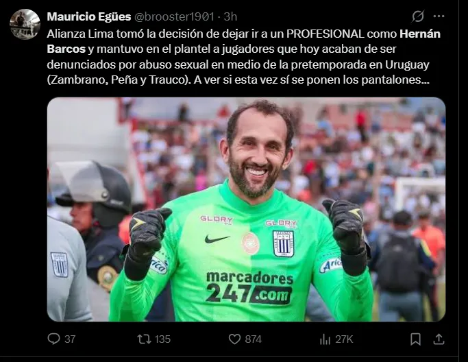 La noticia del día tiene que ver con la denuncia por agresión sexual en contra de Carlos Zambrano, Miguel Trauco y Sergio Peña. Los jugadores de Alianza Lima están implicados en un caso realmente delicado y que viene siendo investigado por la justicia argentina. Frente a dicho panorama es que Hernán Barcos, excapitán en Matute, tuvo una llamativa reacción en redes sociales.