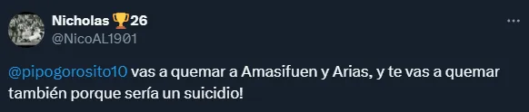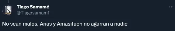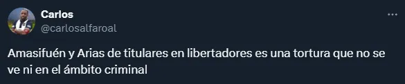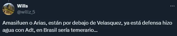 “Gorosito vas a quemar a Amasifuén y Arias, y te vas a quemar porque sería un suicidio“, apuntó un hincha en la red social X (Twitter). “Arias y Amasifuen no agarran a nadie“, tiró otro. “Amasifuén o Arias, están por debajo de Velásquez, ya está defensa hizo agua con ADT. En Brasil sería temerario“, cuestionó otro. Mientras que un aficionado fue más extremista: “Amasifuén y Arias de titulares en Libertadores es una tortura que no se ve ni en el ámbito criminal“.