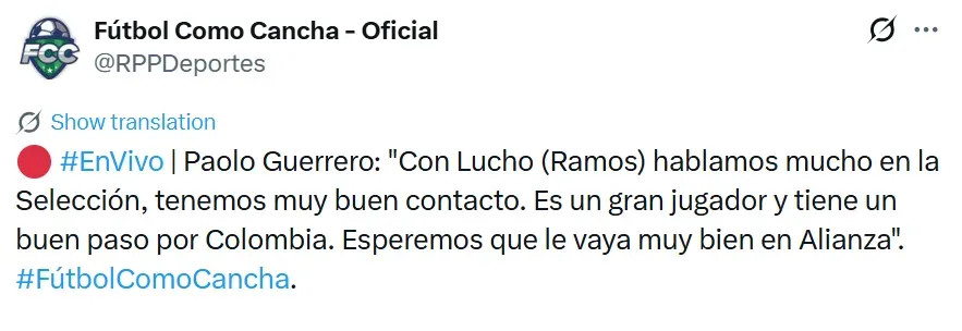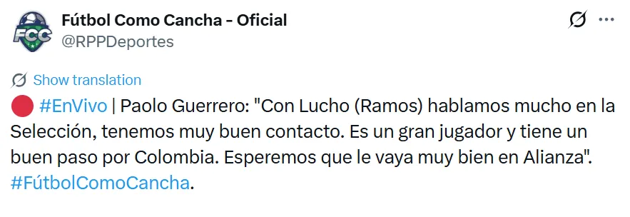 “Con Lucho (Luis Ramos) hablamos mucho en la Selección, cuando hemos podido estar en la Selección hemos hablado de fútbol y cómo se debe jugar, seguramente lo hagamos ahora con Alianza. Es un gran jugador, tiene un buen paso por Colombia, espero que le vaya super bien y que anote muchos goles, porque eso es lo que se quiere para el equipo”, señaló Guerrero.