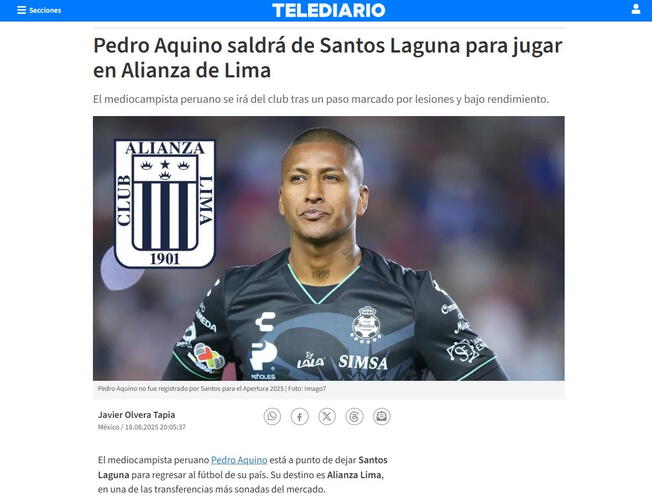 Finalmente, tras este período de altibajos y desafíos, Pedro Aquino concluyó su etapa en el fútbol mexicano. Su regreso a Alianza Lima en Perú fue interpretado por la prensa azteca como un paso necesario y estratégico para que pudiera recuperar su mejor forma física y futbolística en un entorno más familiar y de menor presión. Aunque su paso por México tuvo momentos de gran brillantez, especialmente al inicio con el América, su experiencia en Santos Laguna dejó un sabor agridulce, un recordatorio de lo que pudo haber sido. Podemos decir, que Pedro Aquino no logró consolidarse como la gran figura que se proyectó inicialmente, y su vuelta a Perú marca el cierre de un ciclo complejo y desafiante en su carrera, pero con la esperanza de un nuevo comienzo y la posibilidad de reencontrar su mejor versión.