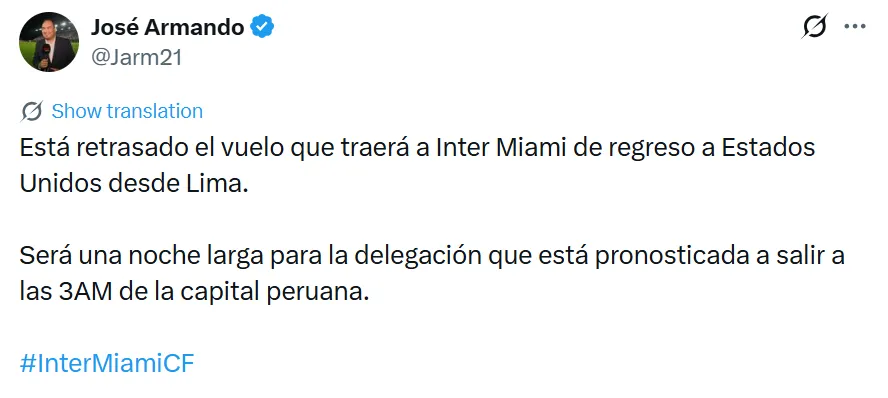 “Está retrasado el vuelo que traerá a Inter Miami de regreso a Estados Unidos desde Lima“, señaló el mencionado comunicador. Recordemos que el plantel se dirigió directamente desde el coloso de La Victoria al aeropuerto con la idea de partir de inmediato rumbo a Miami y así centrarse en su siguiente amistoso frente a Atlético Nacional.