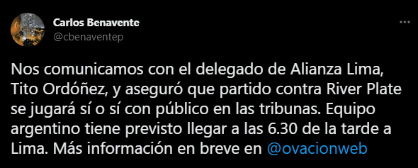 “Nos comunicamos con el delegado de Alianza Lima, Tito Ordóñez, y aseguró que partido contra River Plate se jugará sí o sí con público en las tribunas. Equipo argentino tiene previsto llegar a las 6.30 de la tarde a Lima”. Precisó el comunicador en su cuenta de Twitter, dando pase a la alegría por parte del universo ‘blanquiazul’.