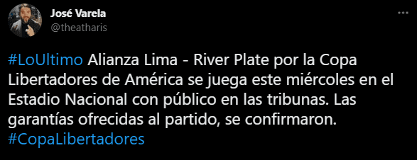 Así mismo, el periodista del ‘Diario Líbero’, José Varela, también respaldó este hecho con un comunicado a su estilo: “Alianza Lima – River Plate por la Copa Libertadores de América se juega este miércoles en el Estadio Nacional con público en las tribunas. Las garantías ofrecidas al partido, se confirmaron”. Todo listo, todo hecho, que ruede el balón en la Copa Libertadores.