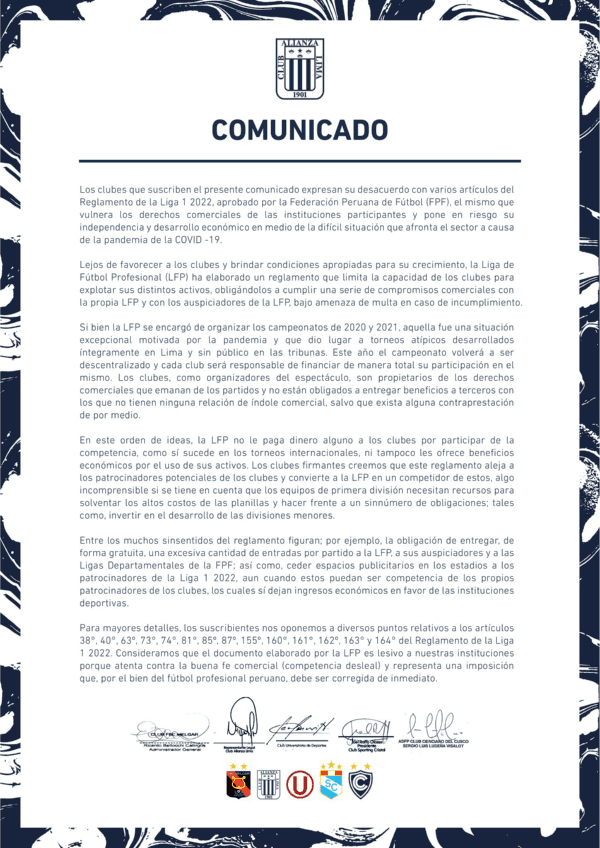 Los clubes que suscriben el presente comunicado expresan su desacuerdo con varios artículos del Reglamento de la Liga 1 2022, aprobado por la Federación Peruana de Fútbol (FPF), el mismo que vulnera los derechos comerciales de las instituciones participantes y pone en riesgo su independencia y desarrollo económico en medio de la difícil situación que afronta el sector a causa de la pandemia de la COVID -19.