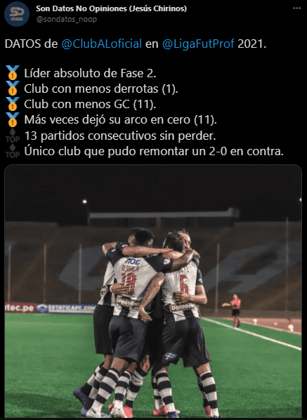 Viendo un tema estadístico, Alianza Lima sumó una nueva casilla en la presente temporada. Así lo referencia la cuenta de Twitter ‘Son Datos No Opiniones’, donde desarrollan lo obtenido hasta ahora por el profesor Bustos y sus muchachos. Ojo a lo que proponen aquí.
