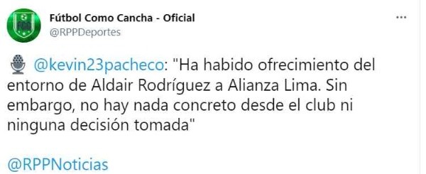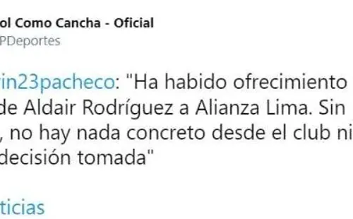 Kevin Pacheco en Fútbol como Cancha, por ejemplo, dio la siguiente primicia: “Ha habido ofrecimiento del entorno de Aldair Rodríguez a Alianza Lima. Sin embargo, no hay nada concreto desde el club ni ninguna decisión tomada”.