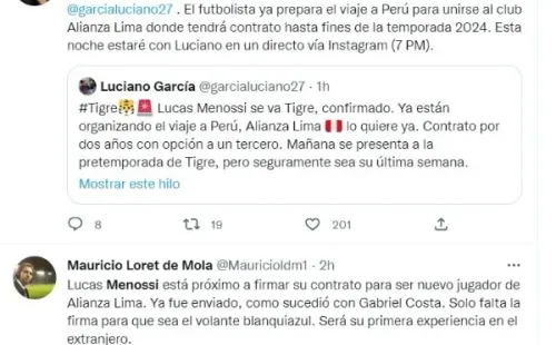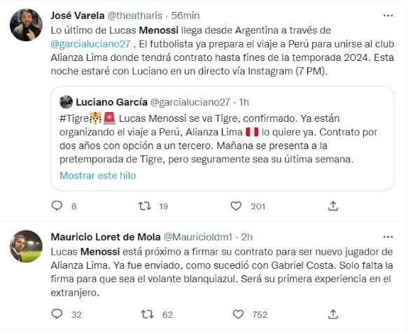 Según los periodistas Mauricio Loret de Mola, José Varela y Luciano García, los tres coinciden en que Lucas Menossi y Alianza Lima tienen un acuerdo. Diferenciados tal vez en que solo falta colocar la firma, los tres mencionan que el contrato completo ya está en poder del volante argentino.