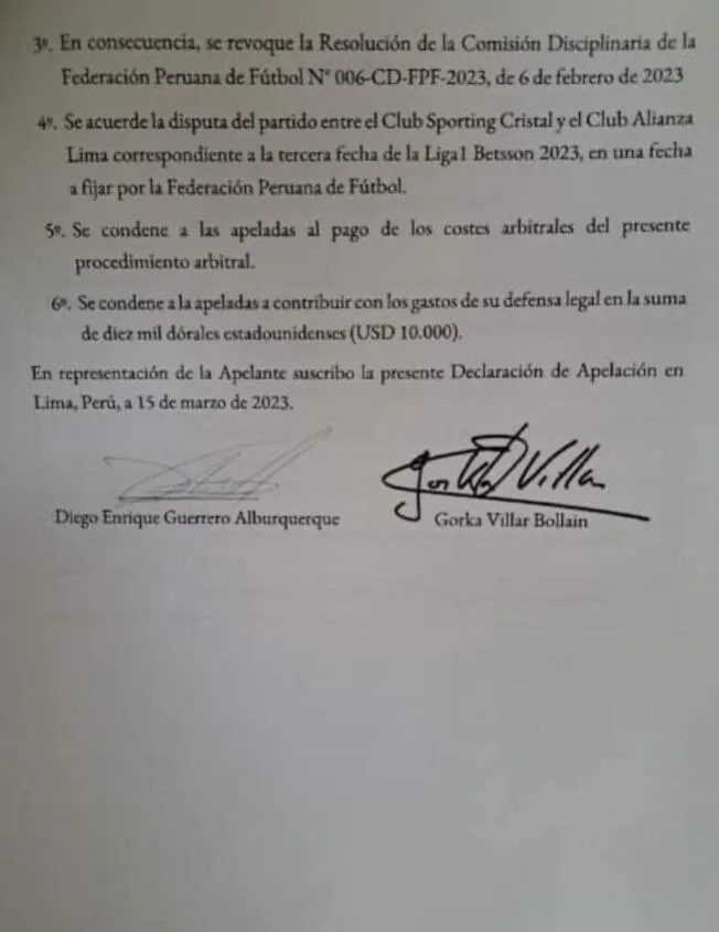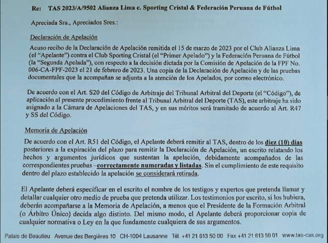 La documentación oficial de Alianza Lima, nos dice lo siguiente: “Recibido la Declaración de Apelación remitida el 15 de marzo de 2023 por el club Alianza Lima contra Sporting Cristal y la Federación Peruana de Fútbol con respecto a la decisión dictada por la Comisión de Apelación de la FPF N° 006-CA-FPF-2023 el 21 de febrero de 2023. Una copia de la Declaración de Apelación y de las pruebas documentales que la acompañan se adjunta a la atención de los Apelados por correo electrónico. De acuerdo con el Artículo S20 del Código de Arbitraje del Tribunal Arbitral del Deporte, de aplicación al presente procedimiento frente al TAS, este arbitraje ha sido asignado a la Cámara de Apelaciones del TAS, y en sus méritos será tramitado de acuerdo al Artículo R47 y SS del Código”.