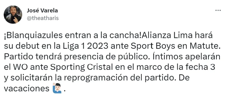 “¡Blanquiazules entran a la cancha!Alianza Lima hará su debut en la Liga 1 2023 ante Sport Boys en Matute. Partido tendrá presencia de público. Íntimos apelarán el WO ante Sporting Cristal en el marco de la fecha 3 y solicitarán la reprogramación del partido”, publicó en su cuenta de Twitter.