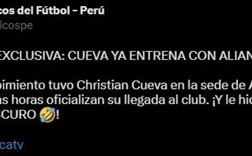 La cuenta de Twitter, Fanáticos del Fútbol – Perú, lanzó el dato, que movió los cimientos: “¡EN EXCLUSIVA: ¡CUEVA YA ENTRENA CON ALIANZA LIMA! Caluroso recibimiento tuvo Christian Cueva en la sede de Alianza Lima. En las próximas horas oficializan su llegada al club. ¡Y le hicieron CALLEJÓN OSCURO!”.