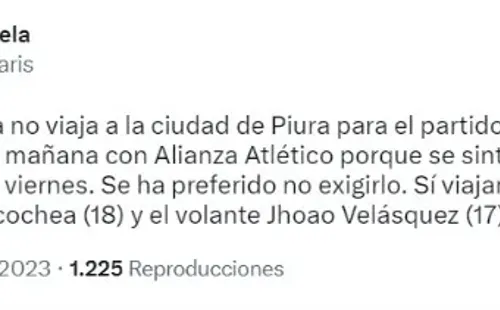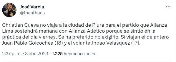 “Christian Cueva no viaja a la ciudad de Piura para el partido que Alianza Lima sostendrá mañana con Alianza Atlético porque se sintió en la práctica del día viernes. Se ha preferido no exigirlo. Sí viajan el delantero Juan Pablo Goicochea (18) y el volante Jhoao Velásquez (17)”, comentó José Varela vía redes sociales.