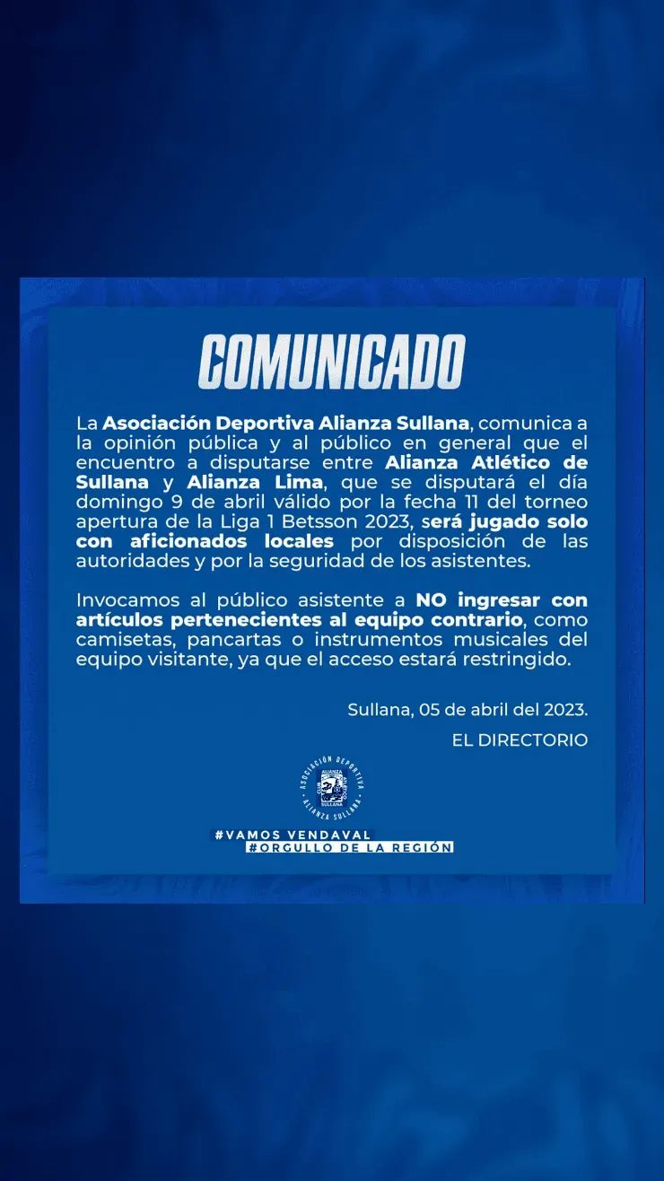 “Alianza Atlético comunica que el encuentro a disputarse entre el club y Alianza Lima se disputará el día domingo 9 de abril solo con aficionados locales por disposición de las autoridades y por la seguridad de los asistentes”, se lee.