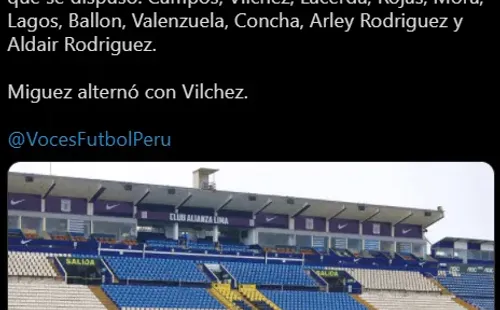 “Hoy Alianza Lima hizo fútbol en Matute y se sigue apostando por la línea de 3 en el fondo, este es un 11 que se dispuso: Campos, Vílchez, Lacerda, Rojas, Mora, Lagos, Ballón, Valenzuela, Concha, Arley Rodríguez y Aldair Rodríguez”. Concluyó con un dato más: “Miguez alternó con Vílchez”.