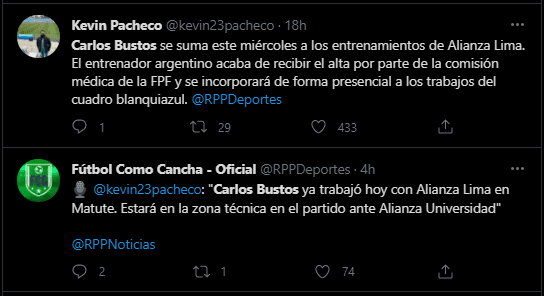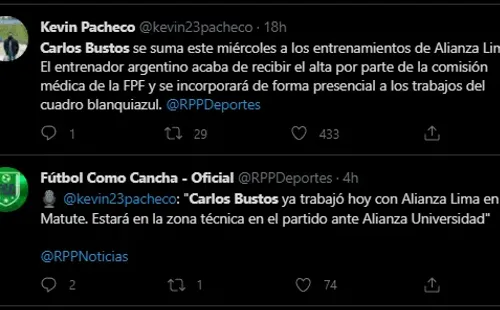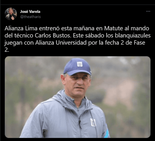 José Varela, del Diario Líbero, comentó detalles al respecto de la vuelta de Carlos Bustos: “Alianza Lima entrenó esta mañana en Matute al mando del técnico Carlos Bustos. Este sábado los blanquiazules juegan con Alianza Universidad por la fecha 2 de la Fase 2”.