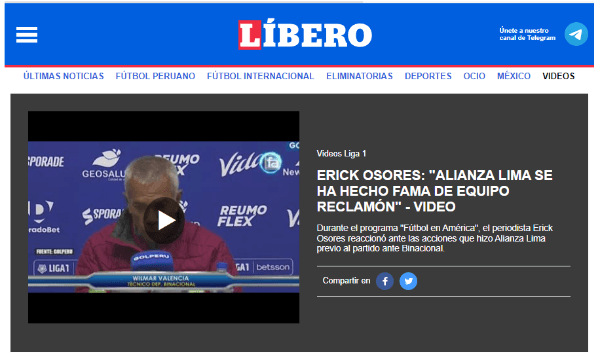 Así lo presentó el ‘Diario Líbero’ en su versión web, siendo el único medio de comunicación que le ha dado cobertura hasta ahora a sus dichos: “Durante el programa “Fútbol en América”, el periodista Erick Osores reaccionó ante las acciones que hizo Alianza Lima previo al partido ante Binacional”.