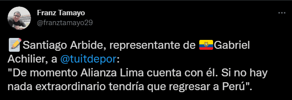 Pero el futuro de Achilier está en nuestro fútbol peruano, así lo reveló el periodista del ‘Diario Depor’, Franz Tamayo, quien conversó con el agente del futbolista ex Monarcas Morelia: “De momento Alianza Lima cuenta con él. Si no hay nada extraordinario tendría que regresar a Perú”. Fue lo que le comentó el Sr. Santiago Arbide.