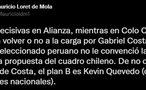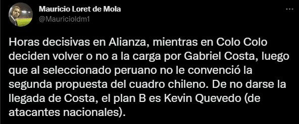Este dato lo presenta así en Twitter: “Horas decisivas en Alianza, mientras en Colo Colo deciden volver o no a la carga por Gabriel Costa, luego que al seleccionado peruano no le convenció la segunda propuesta del cuadro chileno. De no darse la llegada de Costa, el plan B es Kevin Quevedo (de atacantes nacionales)”.