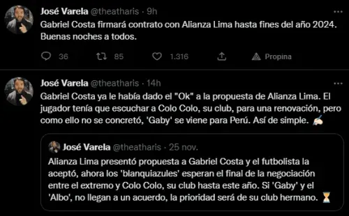 Lo que cuenta el comunicador social, especializado en datos sobre el conjunto íntimo, es lo siguiente, para tenerlo muy en cuenta: “Gabriel Costa ya le había dado el “Ok” a la propuesta de Alianza Lima. El jugador tenía que escuchar a Colo Colo, su club, para una renovación, pero como ello no se concretó, ‘Gaby’ se viene para Perú. Así de simple”.