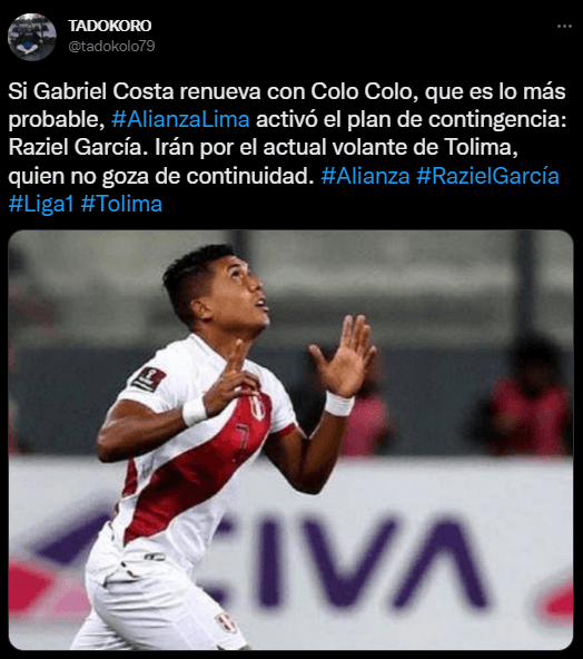 “Si Gabriel Costa renueva con Colo Colo, que es lo más probable, Alianza Lima activó el plan de contingencia: Raziel García. Irán por el actual volante de Tolima, quien no goza de continuidad”, menciona el comunicado social, quien se volvió tendencia entre sus seguidores, a los minutos de publicar este suceso.
