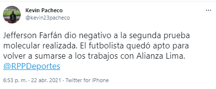 Así lo hizo saber el periodista de RPP Noticias; Kevin Pacheco: “Jefferson Farfán dio negativo a la segunda prueba molecular realizada. El futbolista quedó apto para volver a sumarse a los trabajos con Alianza Lima”.