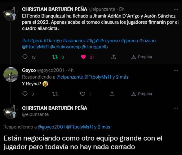 Uno de sus seguidores, le preguntó por Bryan Reyna, y esto respondió Barturén: “Están negociando como otro equipo grande con el jugador, pero todavía no hay nada cerrado”. Todo hace indicar que sería Sporting Cristal, el club que hace referencia el comunicador social. Porque hace unas semanas se filtró el dato que ‘los rimenses’ estaban tras los pasos del Seleccionado Peruano.