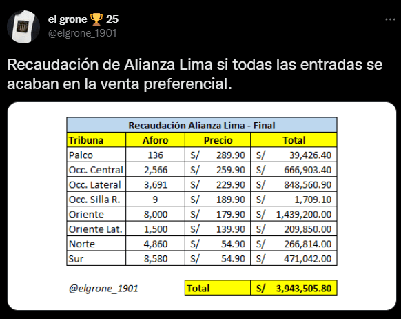 Conocido en Twitter como ‘@elgrone_1901’, subió un cuadro de excel donde podemos ver todo lo mencionado, con el siguiente titular: “Recaudación de Alianza Lima si todas las entradas se acaban en la venta preferencial”. Generando en el hincha un aplauso masivo, porque están contentos por lo que general semana a semana. En el último partido del año 2022, no será la excepción, como era de imaginarse.